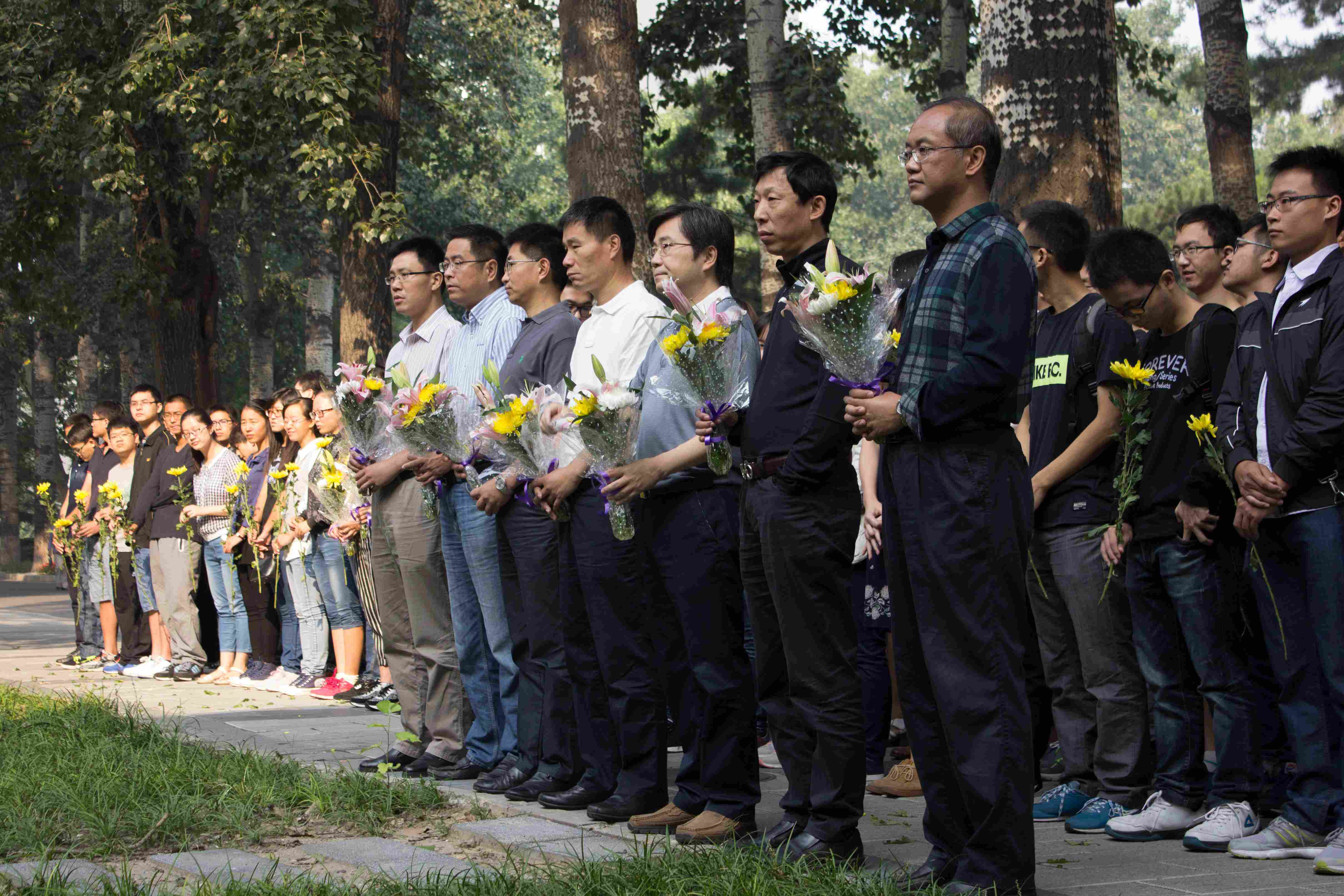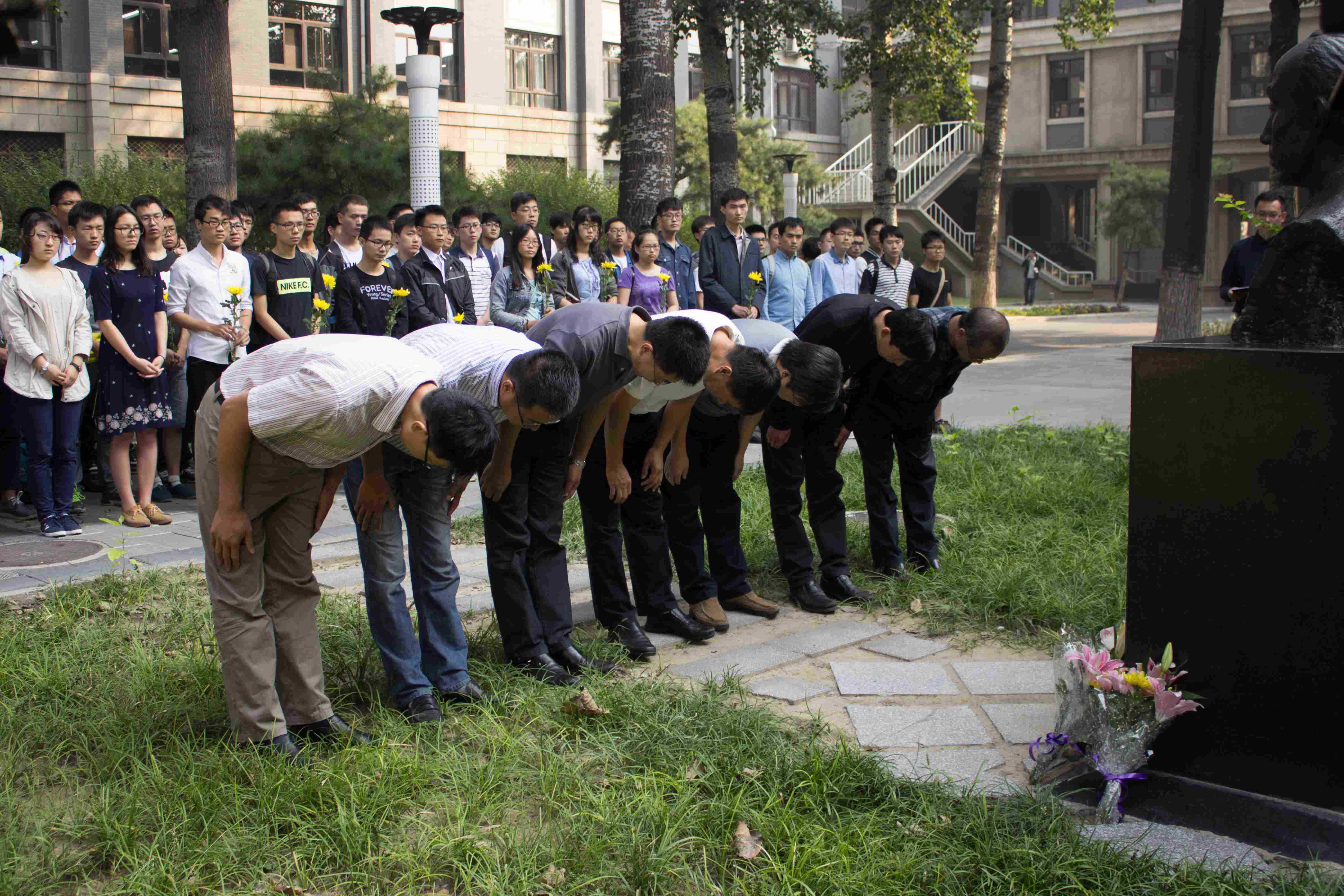 2015年9月15日,我院全体研究生新生聚集在杨为民老师的塑像前,深情缅怀这位开拓创新的学科带头人、敬业奉献的学院奠基者、朴素廉洁的共产党员。院长王自力教授,党委书记赵廷弟教授,副院长刘斌教授、曾声奎教授、王维副教授,党委副书记章文晋教授、党政办主任刘清洁老师与全体15级研究生一起向杨为民老师的塑像献上鲜花,表达深切缅怀。