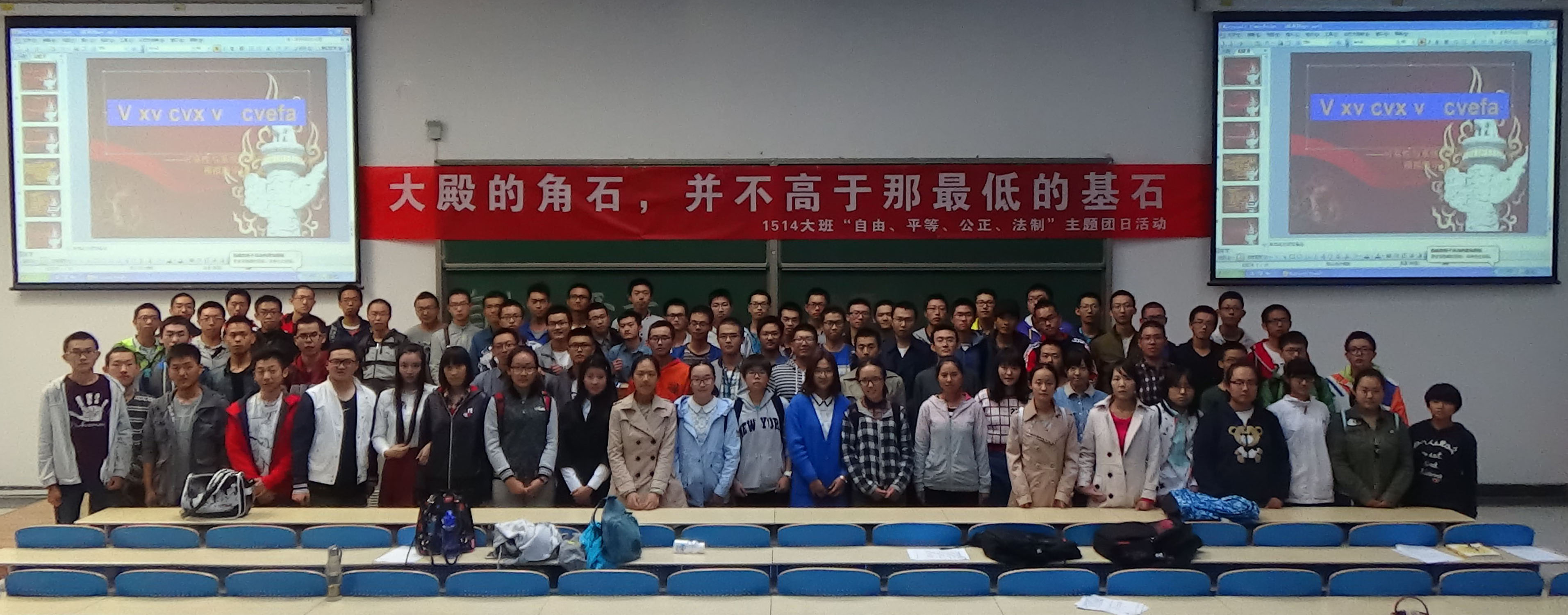 2015年9月27日至10月13日,太阳成集团122cc本科2015级顺利举行以“自由,平等,公正,法制”为主题的团日活动。此次活动由1514团支部组织,全系同学参与,通过采访与模拟陪审团活动两种形式展开。