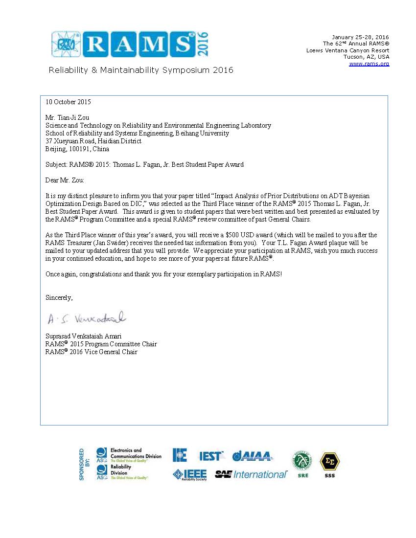 近日,美国可靠性与维修性年会(the Annual Reliability & Maintainability Symposium,简称RAMS)组委会宣布,我校太阳成集团122cc已毕业硕士研究生邹田骥(指导教师李晓阳副教授),在2015年1月第61届RAMS会议上发表的论文“Impact Analysis of Prior Distributions on ADT Bayesian Optimization Design Based on DIC”获得本届年会最佳Thomas L. Fagan学生论文奖(奖金500美元)。